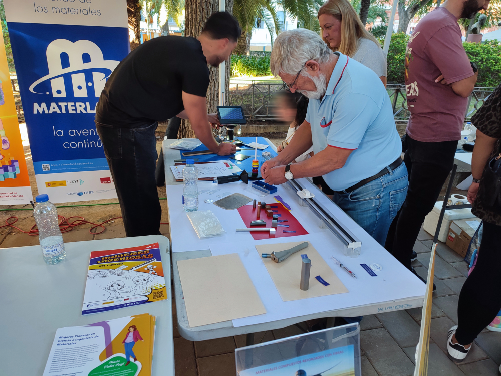 El viernes 26 de septiembre en La Noche Europea de los Investigadores y las Investigadoras, una gran feria al aire libre pensada para que familias con menores disfruten de la ciencia y la ingeniería en primera persona. La actividad se desarrolló en los Jardines del Prado de Ciudad Real, en horario de 17:00 a 20:00, con una gran afluencia de público. Participamos con descubre materiales con el microscopio, juego de mesa conecta, tren Maglev para experimentar el electromagnetismo y materiales ligeros de la industria aeronáutica y regalamos un díptico de Mujeres en Ciencia e Ingeniería de Materiales.
