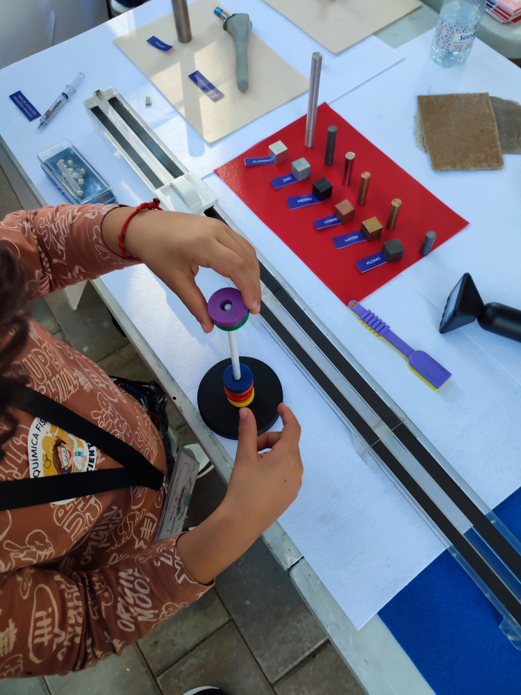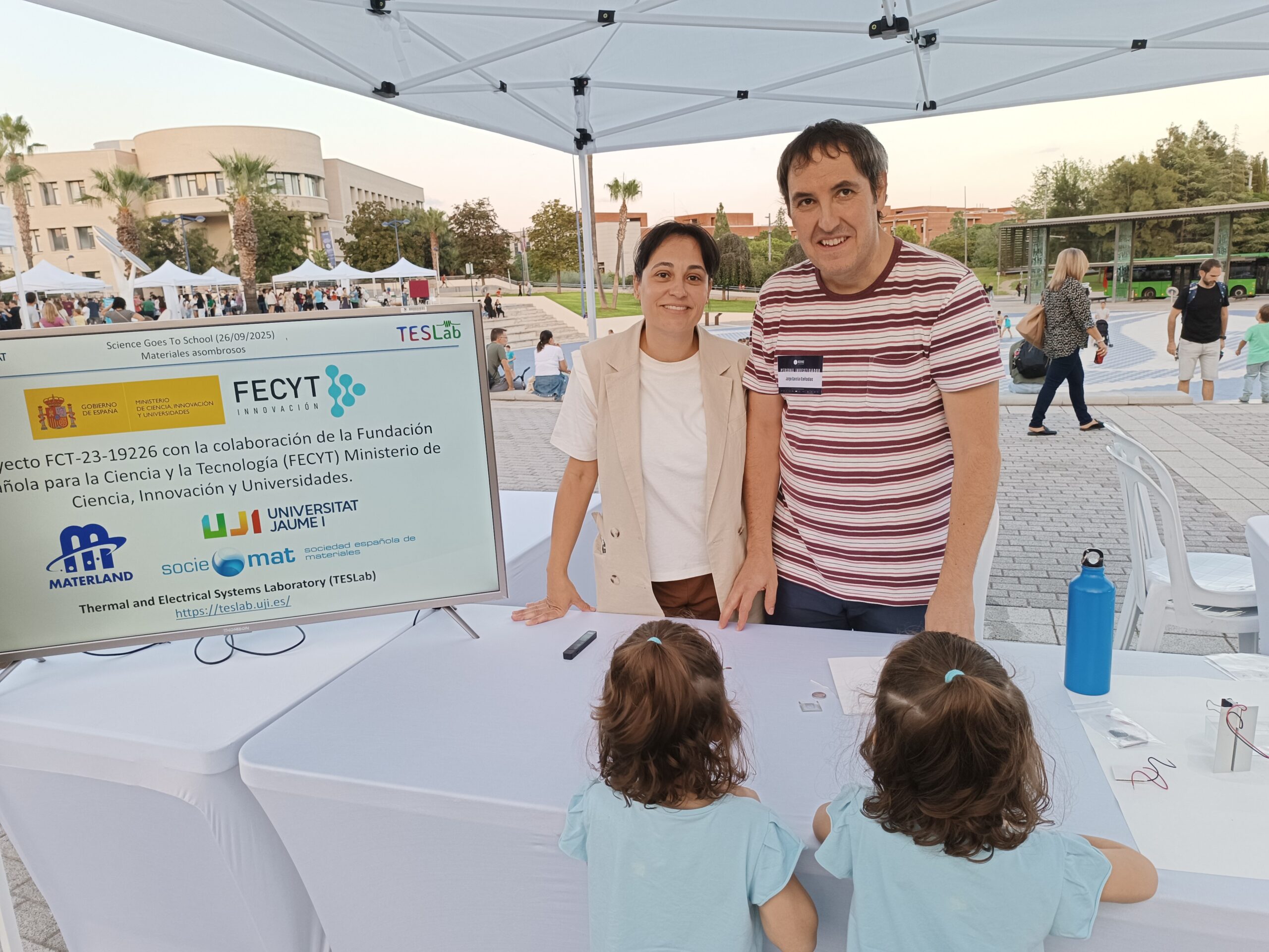 Taller Materiales Sorprendentes, donde se presentan diversos materiales con propiedades asombrosas: (i) Materiales termoeléctricos que generan electricidad al aplicar calor (usando agua caliente y fría para mover un molinillo de aspas). (ii) Materiales electrocrómicos que producen pequeñas pantallas flexibles que cambian de transparentes a azules mediante electricidad, mostrando información. (iii) Hilo de fibra óptica que permite la conducción de luz láser en su interior, a pesar de que la luz láser se desplaza en línea recta. Universidad Jaume I. 27/09/2024