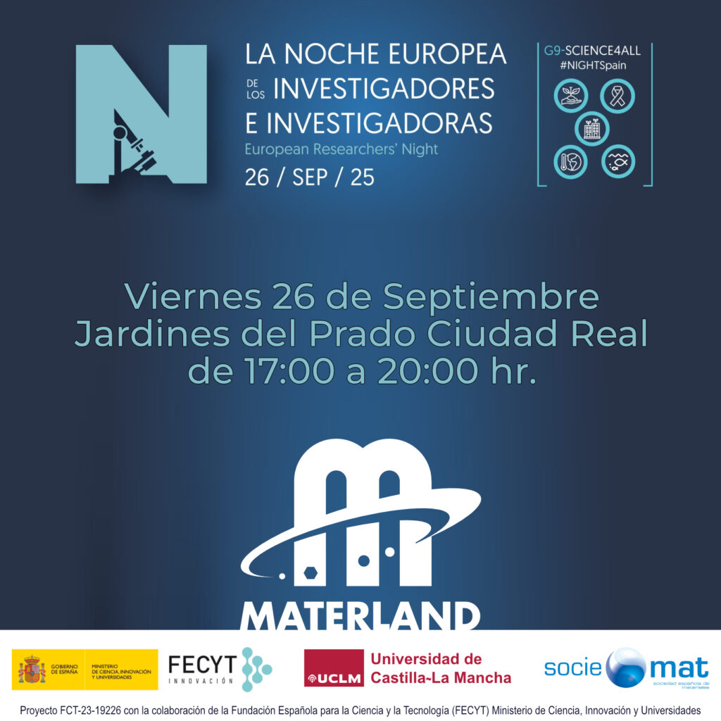 - La Noche Europea de los Investigadores e Investigadoras en Toledo. Materland: biemvenido al maravilloso mundo de los materiales. Gloria Rodríguez y Ana Romero. Toledo. 25/09/2021.